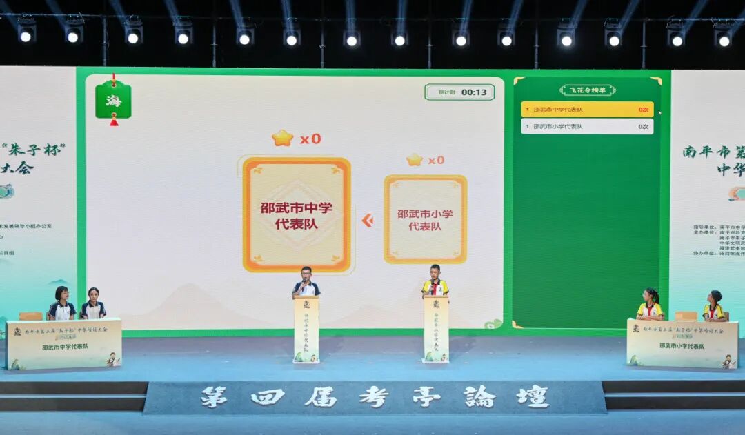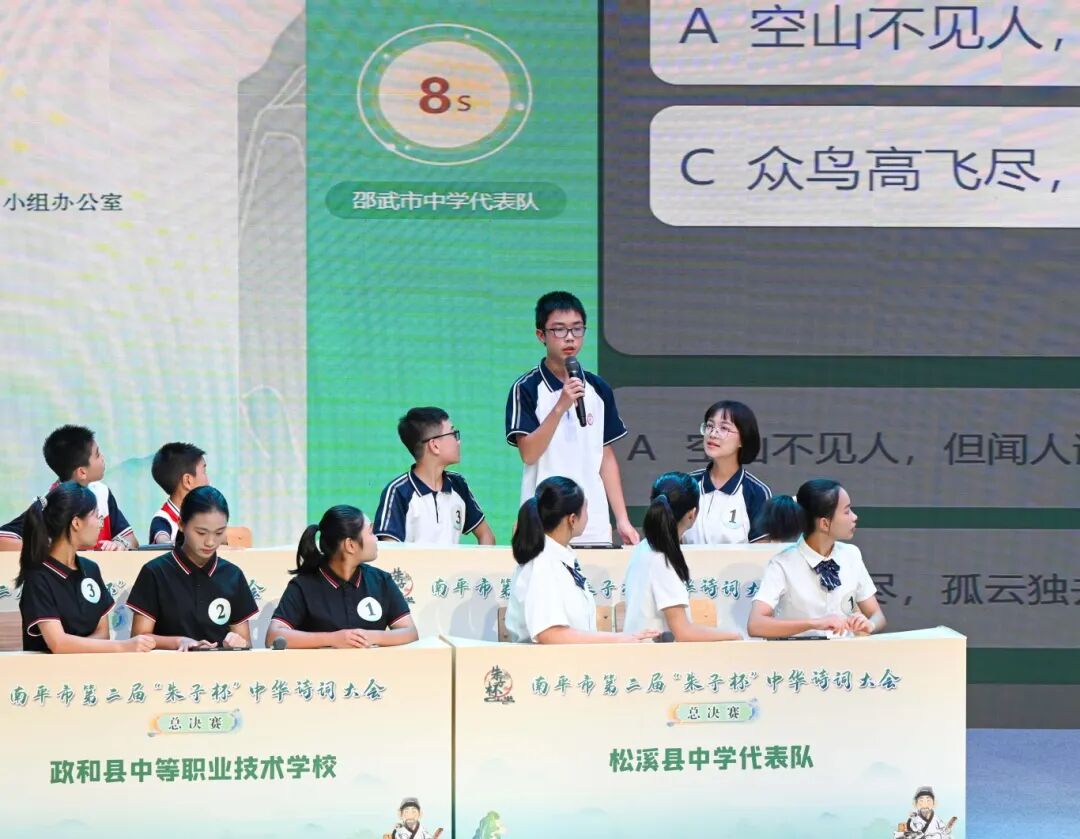 经过层层选拔、激烈角逐,全市有6支队伍闯进第二届“朱子杯”中华诗词大会总决赛,参赛选手依次参与必答题、抢答题、飞花令等环节比拼,全面考验选手们的诗词素养和现场应变能力。比赛以“大思政”教育为引领,将朱子文化融入赛事各环节,让更多人感受中华诗词的独特魅力,增强对中华优秀传统文化的认同感和自豪感。最终,邵武市中学代表队、邵武市小学代表队分别斩获冠、亚军。总决赛全程同步直播,吸引超210万人次线上观赛。