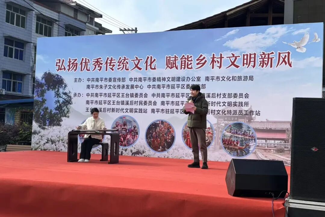 活动现场暖意融融,文艺演出率先拉开帷幕。歌舞、乐器、民俗表演等节目轮番登场,演员们以饱满的热情演绎着与传统文化相关的精彩内容,台上好戏连台,台下掌声不断,热闹的氛围感染着每一位村民。尤其是融入朱子非遗古琴的《九曲棹歌》配乐诗朗诵,将朱子书写南平的美景生动呈现,让村民们在潜移默化中受到熏陶。